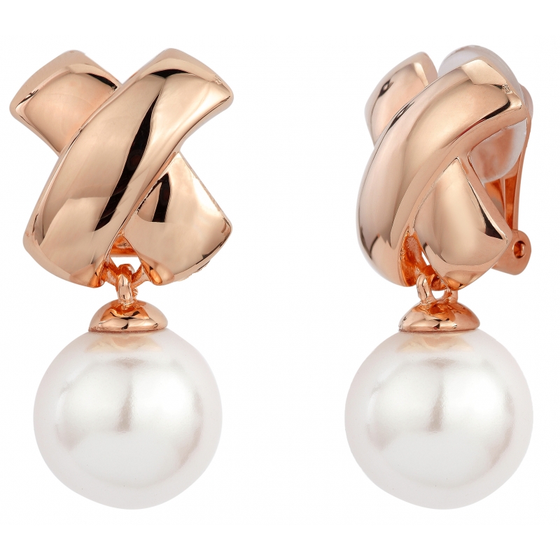 Traveller Ohrclip - Hängend - rose vergoldet - 14mm Perlen weiß