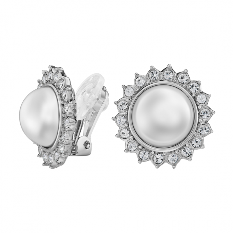 Traveller Clip Earrings - Platinum Plated - Pearl Ø 12mm - White - Crystals - Sun - Ø 20mm
