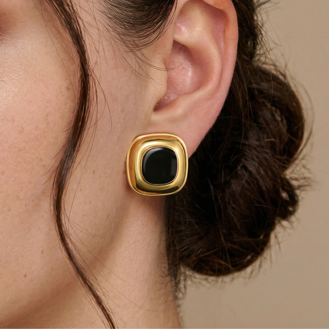 Traveller Clip Earrings - Gold Plated - Black Enamel - 12x12mm - Square - 20mm - Square