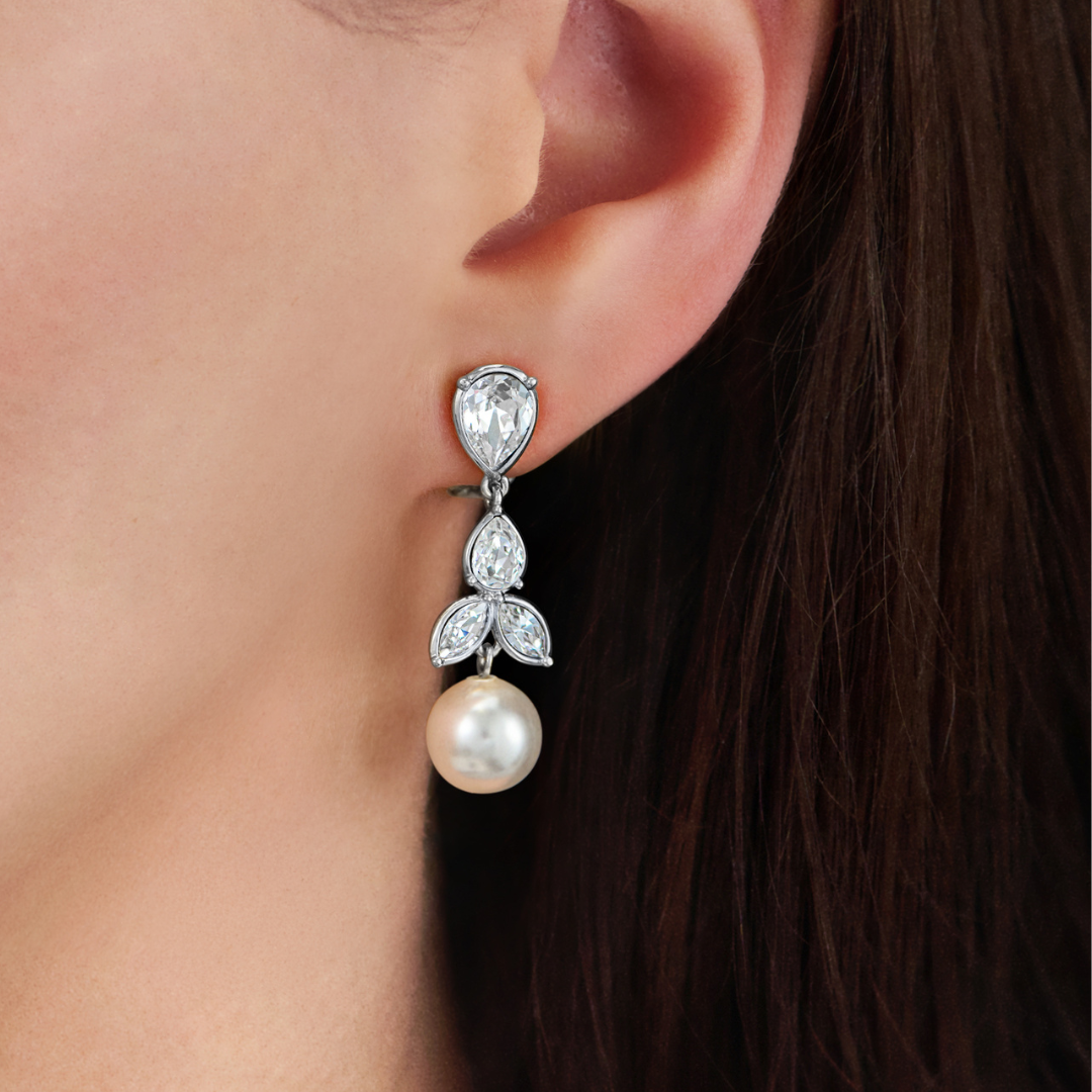Traveller Drop Clip Earrings - Silver Coloured - Pearls - 10mm - White - Crystals - Platinum Plated - 35x10mm