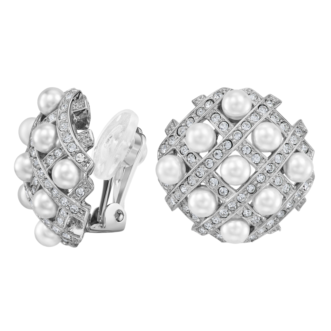 Traveller Clip-on Earrings - Platinum Plated - Pearls - 4mm - White - Crystals - 22x22mm