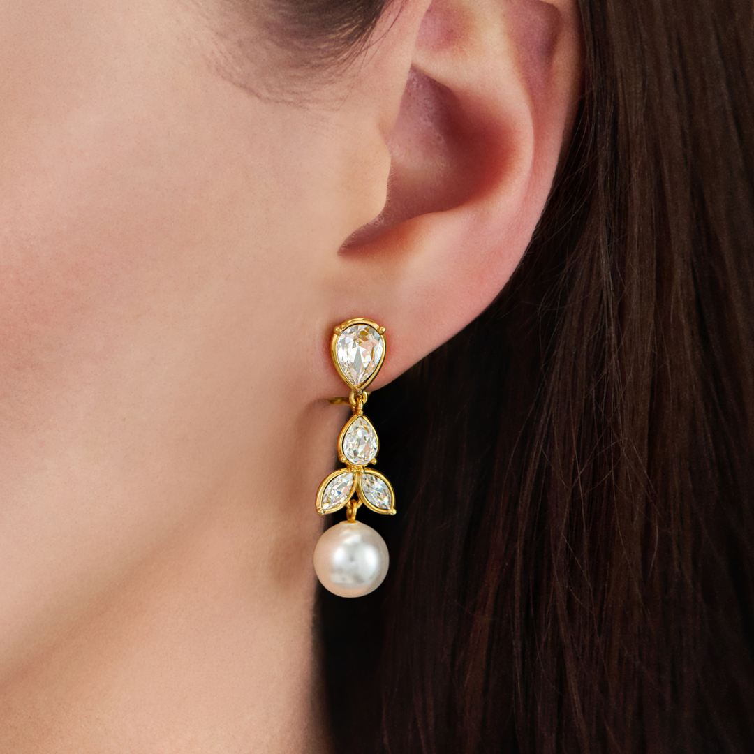 Traveller Boucles d'oreilles clip pendants - Doré - Perles - 10 mm - Blanc - Cristaux - 35x10 mm