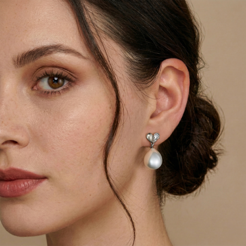Traveller Boucles d'oreilles clip pendants - Platiné - Perles - 14x12 mm - Blanc - Cristal - Cœur& Goutte - 20x12 mm