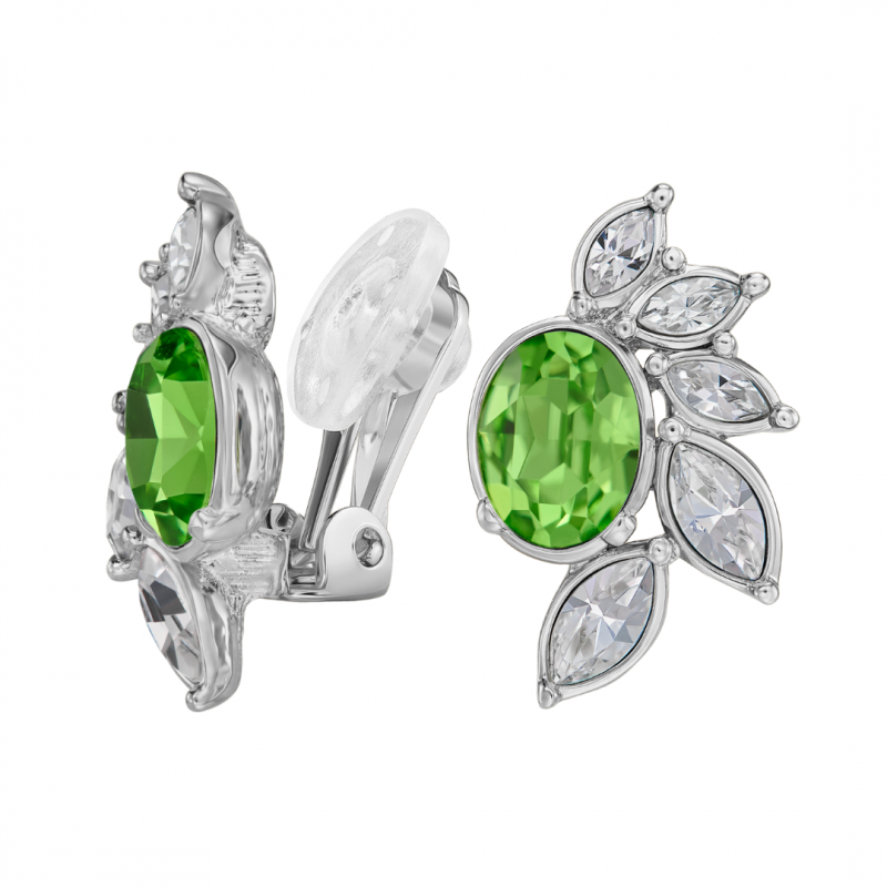 Traveller Oorclips - Geplatineerd - Kristallen - Groen / Peridot - 20x12 mm