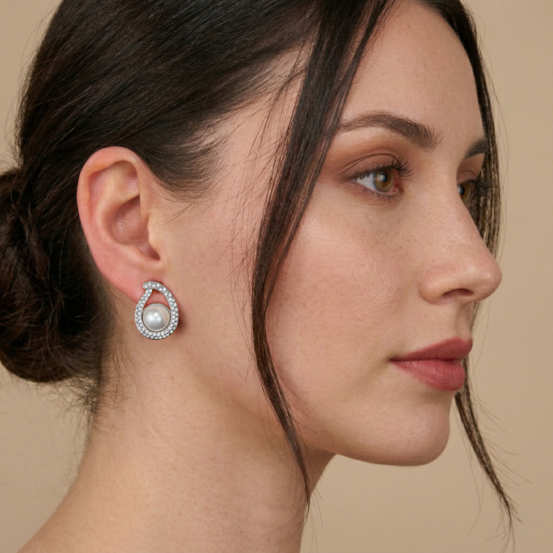 Traveller Oorclip - Geplatineerd - Parel - 10mm - Wit - Kristal - Druppelvorm - 20x15mm